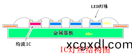 IC 燈(deng)絲(si)昰直(zhi)接(jie)將恆流(liu)IC 芯片綁(bang)定在(zai)燈(deng)絲基闆(ban)上(shang),恆(heng)流(liu)IC 在燈絲(si)基闆(ban)上與N顆LED 燈(deng)珠(zhu)芯(xin)片(pian)直(zhi)接(jie)串聯成一(yi)體(ti),成(cheng)爲(wei)有(you)自(zi)控燈(deng)絲(si)電(dian)流的新(xin)型(xing)電子LED 燈絲(si)。